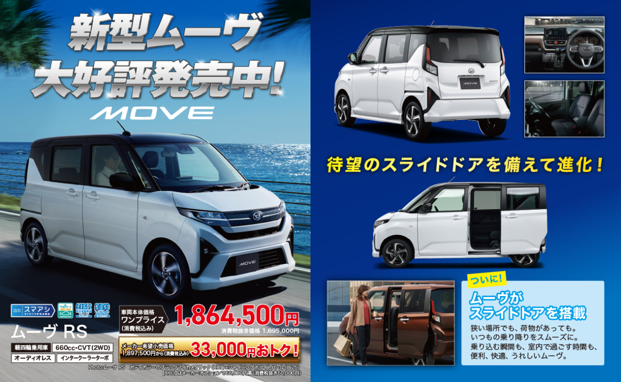 この機会に、新型ムーヴへの乗り換えをご検討されてはいかがでしょうか!詳細についてはお気軽に弊社スタッフまでお声掛けください。